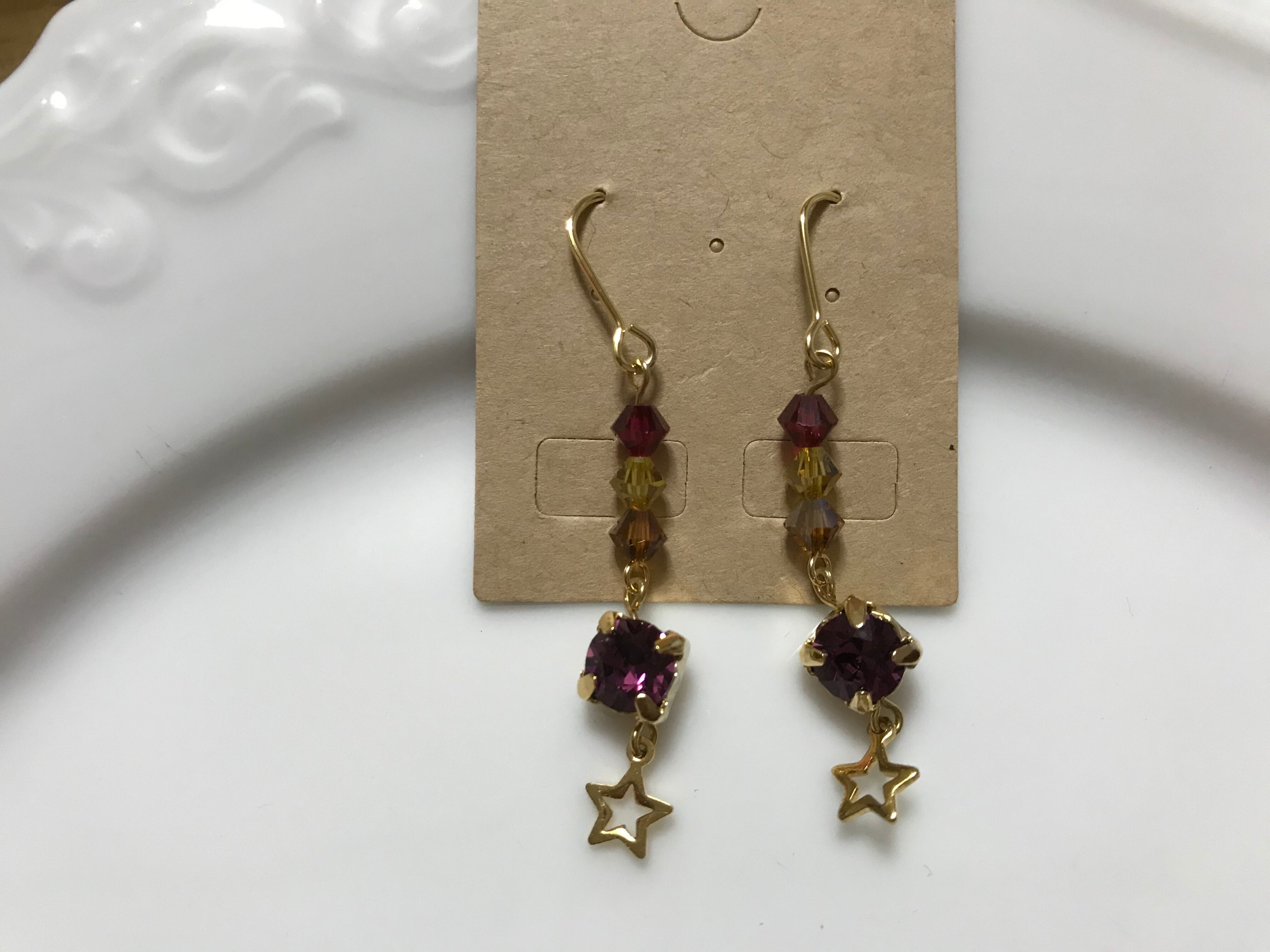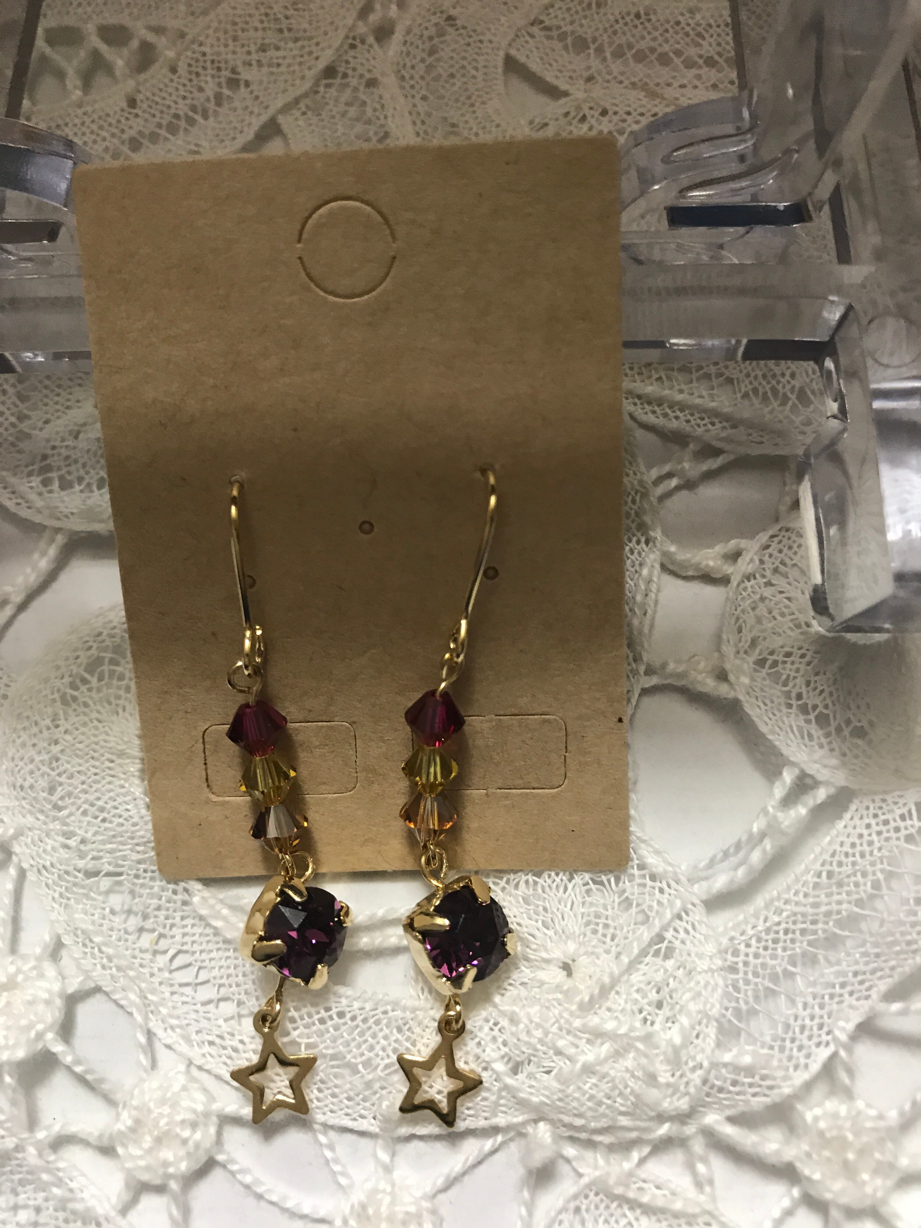 こちらの商品は小ぶりで星がキラキラ輝いてるピアスです。いろいろな小さなスワロが輝いている商品です。