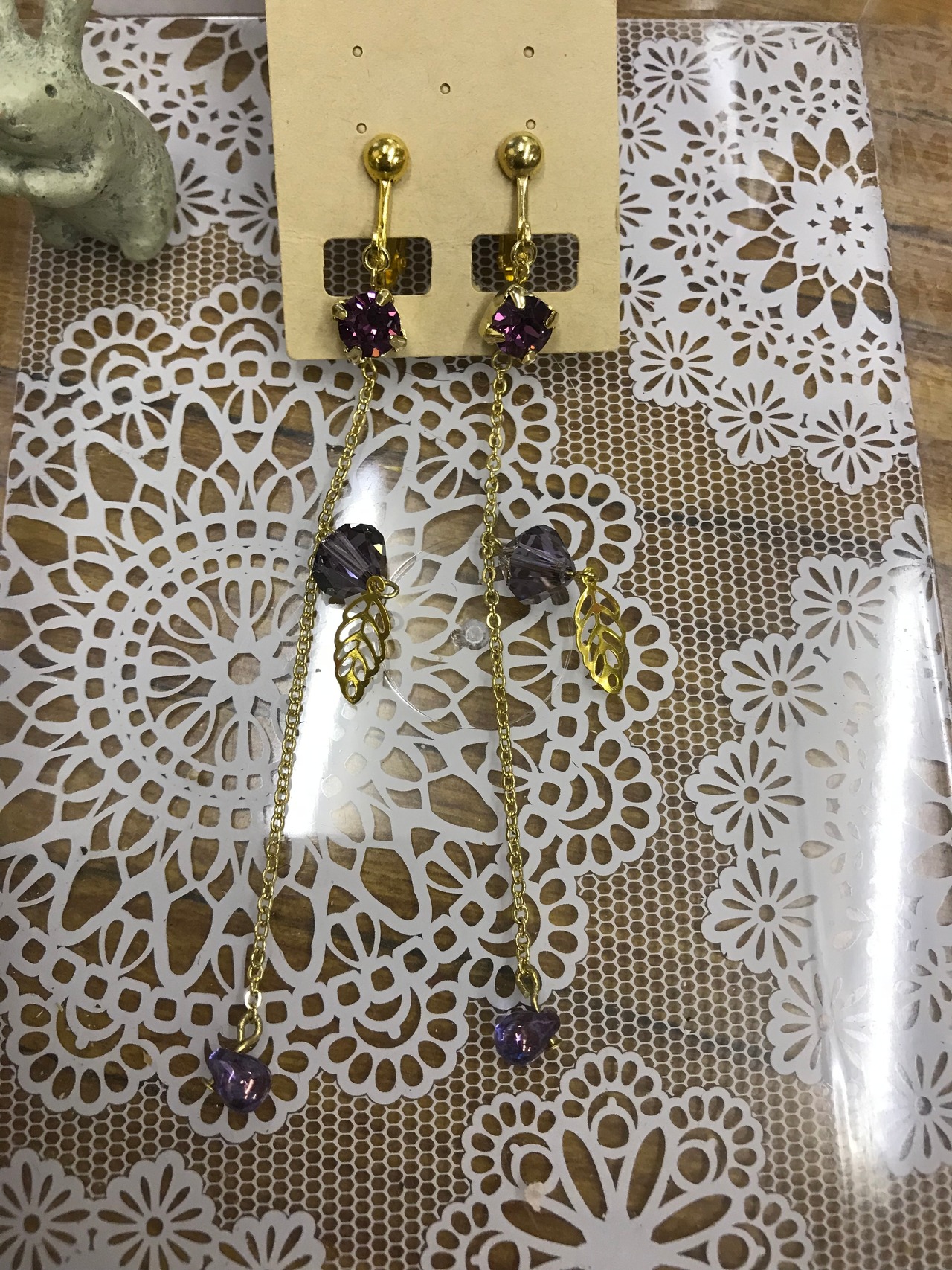 こちらの商品は紫のスワロフスキーが輝いているしずく型のイヤリングです。