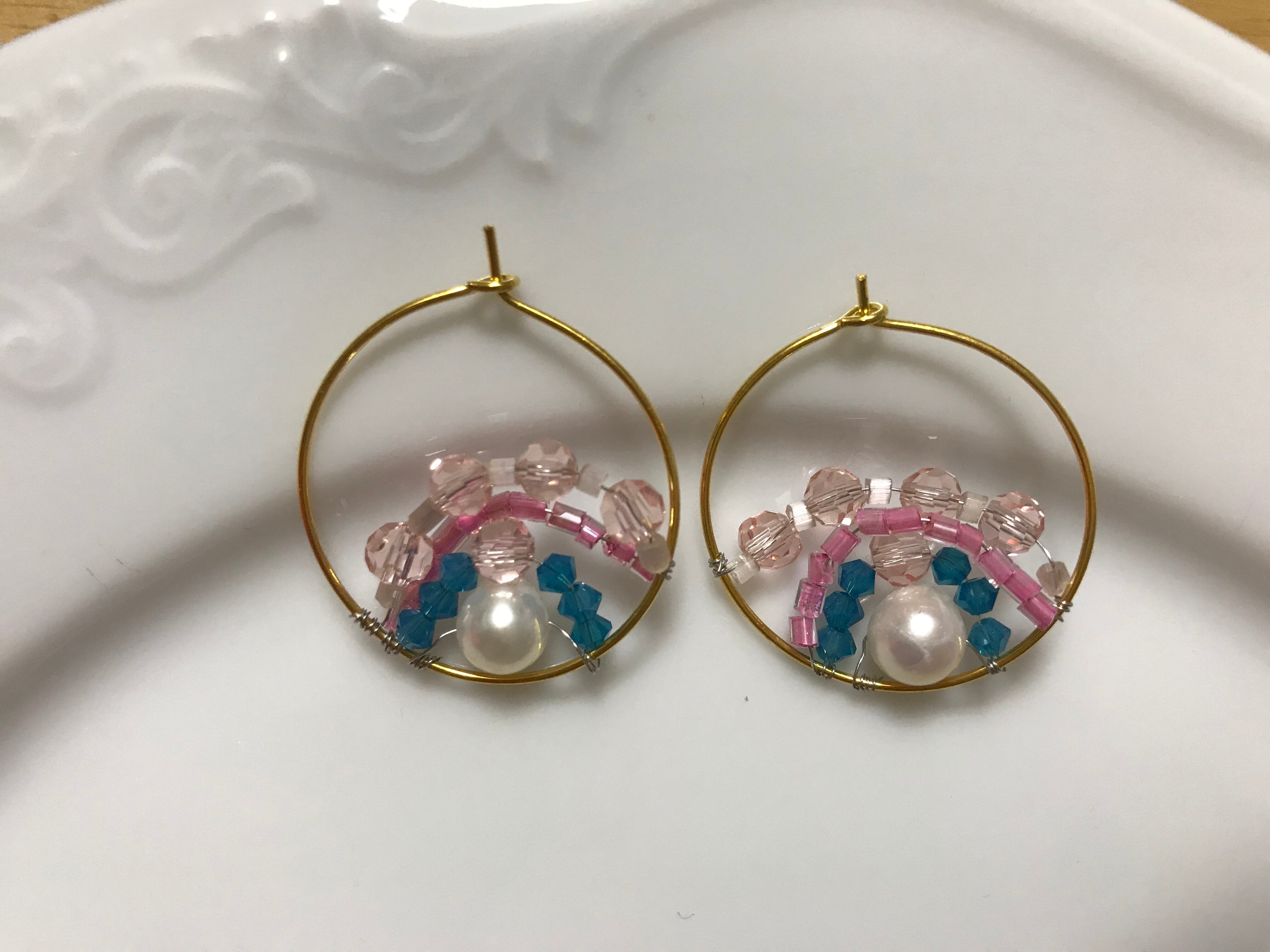 手作りのエメラルドグリーン色とピンクのフープピアス